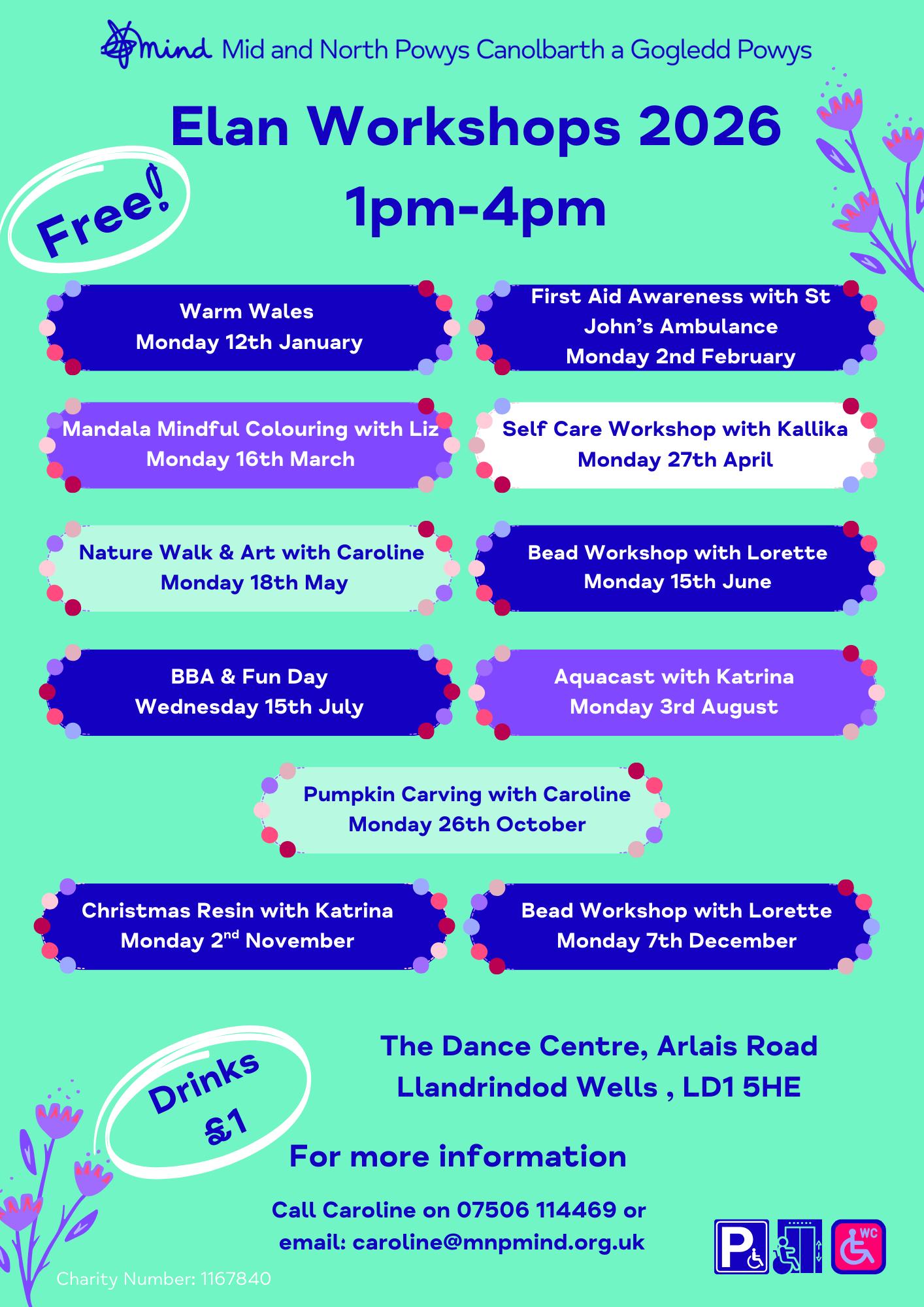 Our workshops for 2026 include some craft workshops, a nature walk, a self-care workshop and visits from Warm Wales and St John’s Ambulance. Click the poster for a bigger readable picture, or contact Caroline.